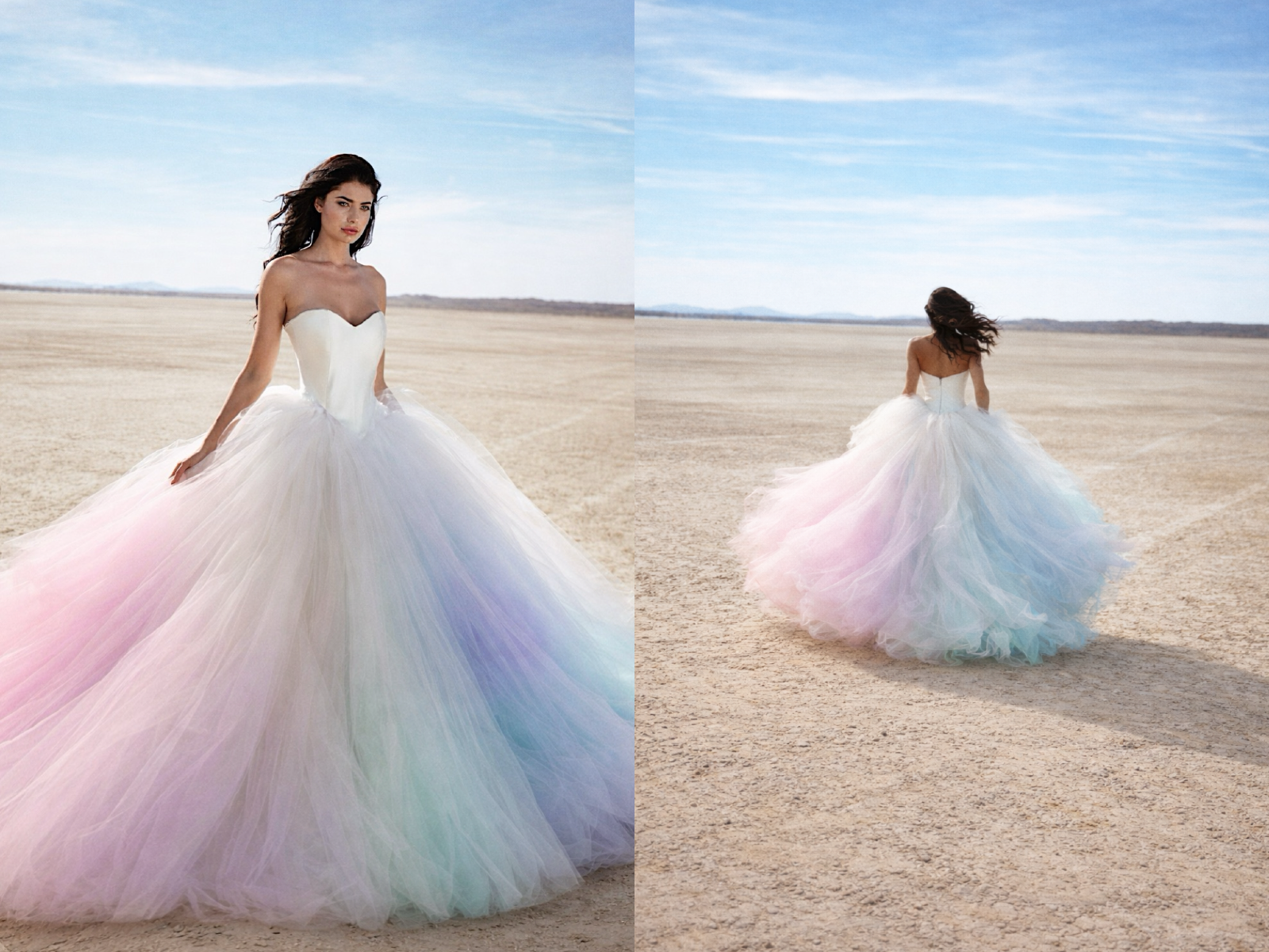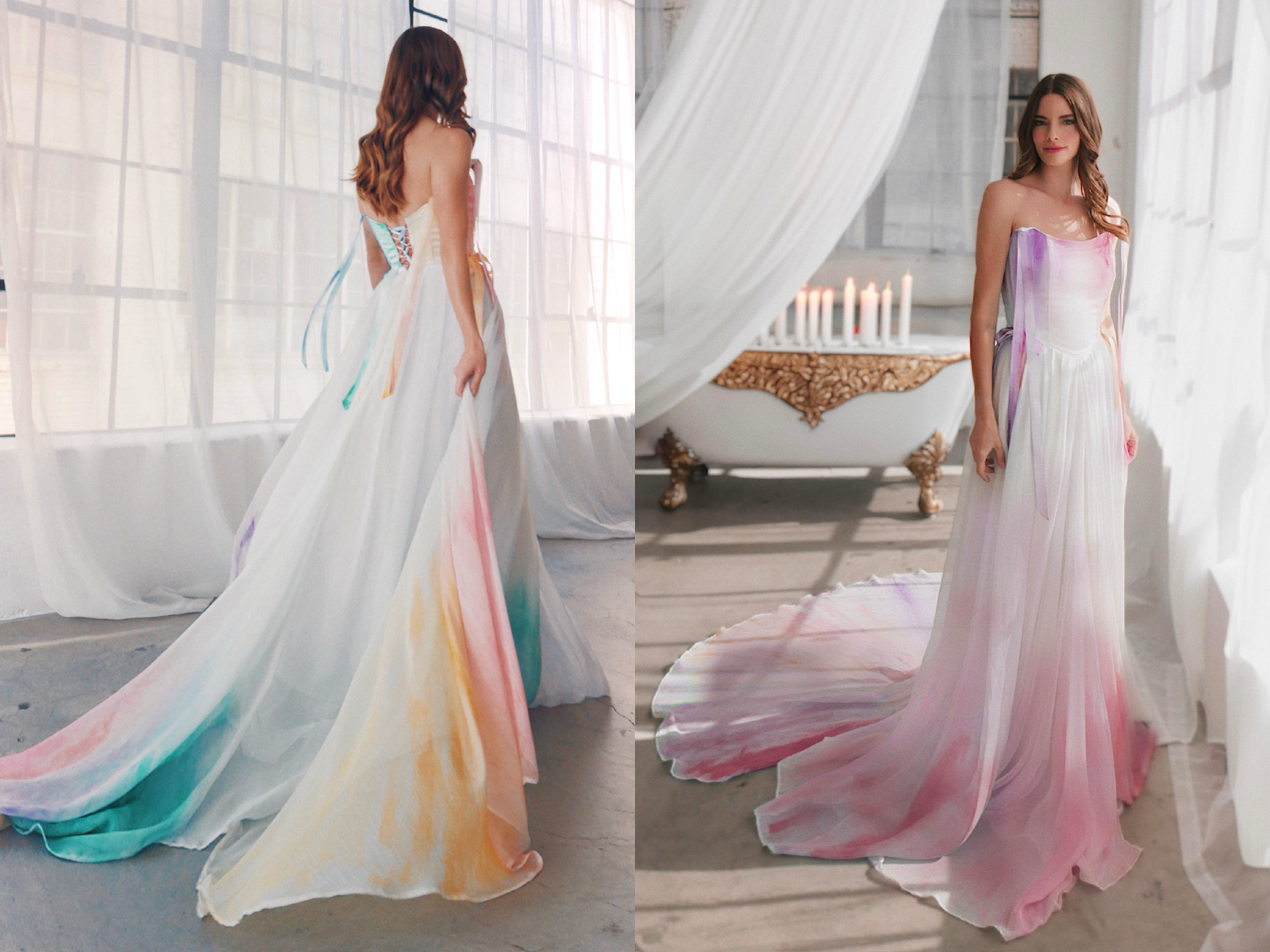 A look at custom "Unicorn" gown created by combining our "Dreama" and "Aria" Gown styles into an ultra violet rainbow confection.